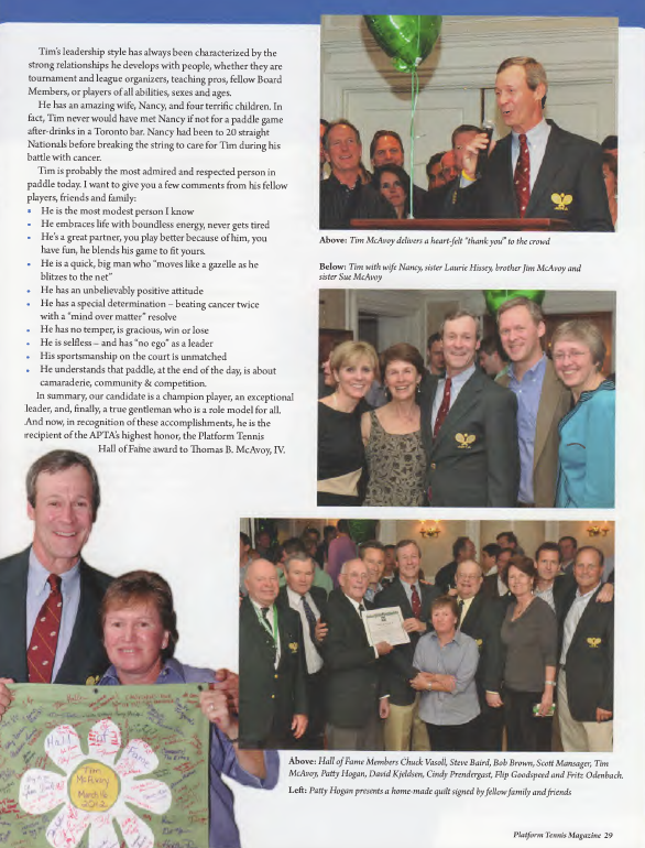 And now, in recognition of these accomplishments, he is the recipient of the APTA’s highest honor, the Platform Tennis Hall of Faille award to Thomas B. McAvoy, IV.