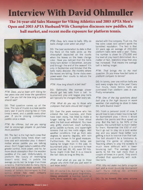 The 34-year-old Sales Manager for Viking Athletic and the 2003 APTA Men’s Open and Husband/Wife Champion discusses new paddles, the ball market, and recent media exposure for platform tennis.