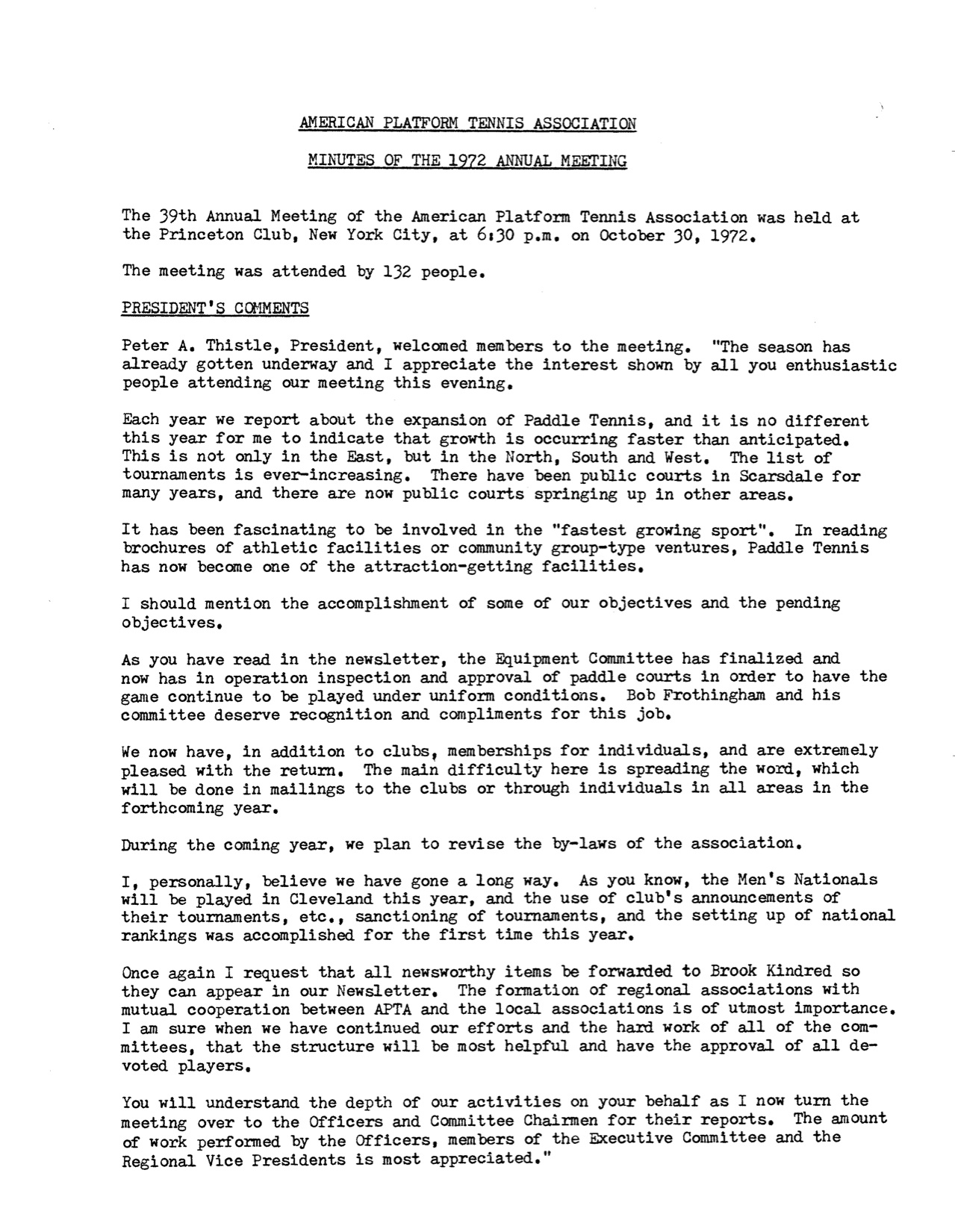 President Peter Thistle reported on the escalating growth of the sport; the increasing tournament activity; the establishment of the Equipment Committee to ensure uniform playing conditions for the game, and the success of the new initiative to include individual membership in the APTA.