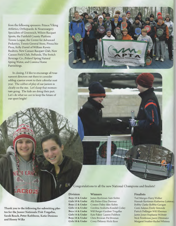 I want to thank my excellent tournament committee and the many volunteers who helped throughout the weekend. The tournament also would not have been possible without the generous financial or in-kind contributionsfrom the following sponsors: Prince/Viking Athletics, Orthopaedic & Neurosurgery Specialists of Greenwich, Wilson Racquet Sports, the Fairfield County Platform Tennis League, the Center for Advanced Pediatrics, Tennis General Store, Pinocchio Pizza, Kelly Daniel of William Raveis Realtors, New Canaan Racquet Club, New Canaan Field Club, BeBands, The Switch Beverage Co., Poland Spring Natural Spring Water, and Comma Home Furnishings.
