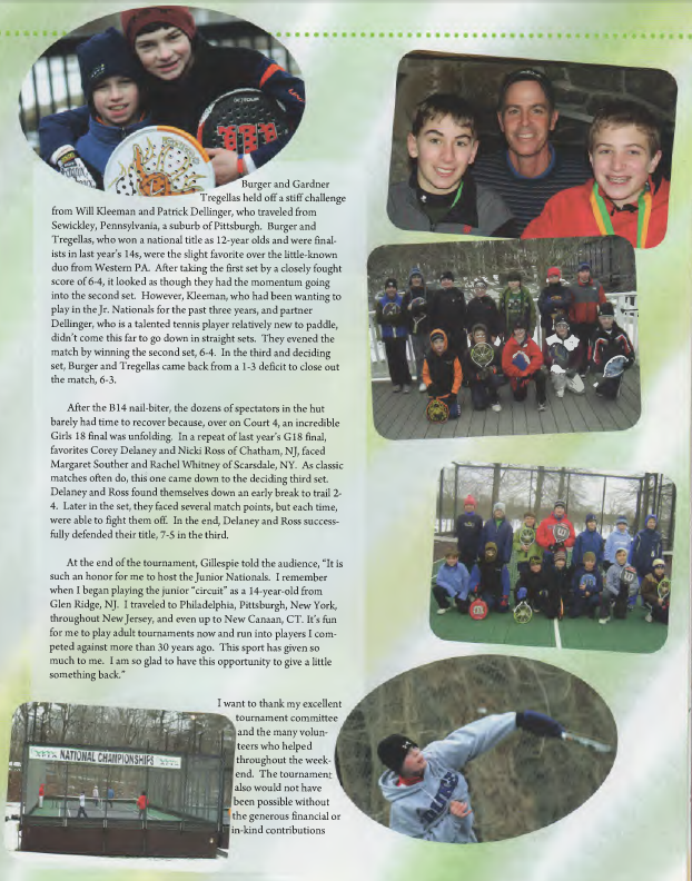 At the end of the tournament, Gillespie told the audience, “It is such an honor for me to host the Junior Nationals. I remember when I began playing the junior “circuit” as a 14 year-old from Glen Ridge, NJ. I traveled to Philadelphia, Pittsburgh, New York, throughout New Jersey, and even up to New Canaan, CT. It’s fun for me to play adult tournaments now and run into players I competed against more than 30 years ago. This sport has given so much to me. I am so glad to have this opportunity to give a little something back”
