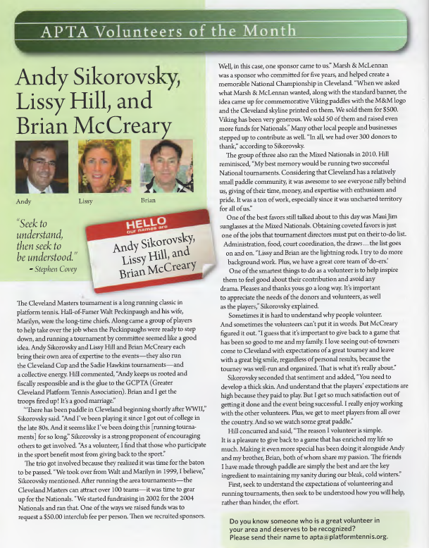 Hill commented, “Andy keeps us rooted and fiscally responsible and is the glue to the GCPTA (Greater Cleveland Platform Tennis Association). Brian and I get the troops fired up! It’s a good marriage.”