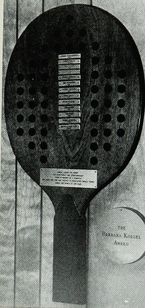 During her tenure as ladies chairman, Clare Kingsbury and her committee proposed that the Club create a suitable memorial for Barbara Koegel, who died in 1968. The award reads, “given in memory of a champion who gave her time and talents to develop paddle tennis among women of our Club.” Presented to women Club members for achievement and sportsmanship, the Koegel award winners are listed on a plaque created in the form of a huge paddle by Scott Wood.