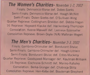 In the women’s open tournament, last season’s finalists Aery/Viant and Fulton/Prendergast were no-shows. Therefore, the draw was ripe for the picking. The biggest quarter-final upsets came when 5th seeded Kerri Delmonico and Shelly Morse upset the top-seeded team of Tonia Mangan and Bobo Delaney. They proceeded to defeat Jane McNitt and Leslie Hough (who defeated 3rd seeded Hilary Debbs and Patty Hogan) in a three-set semi-final match. In the other half of the draw, 2nd seeded Mary Doten and Julia Sierks held their ground to reach the finals. Kerri and Shelly won the finals (their first Charities Title) in a hard-fought match.