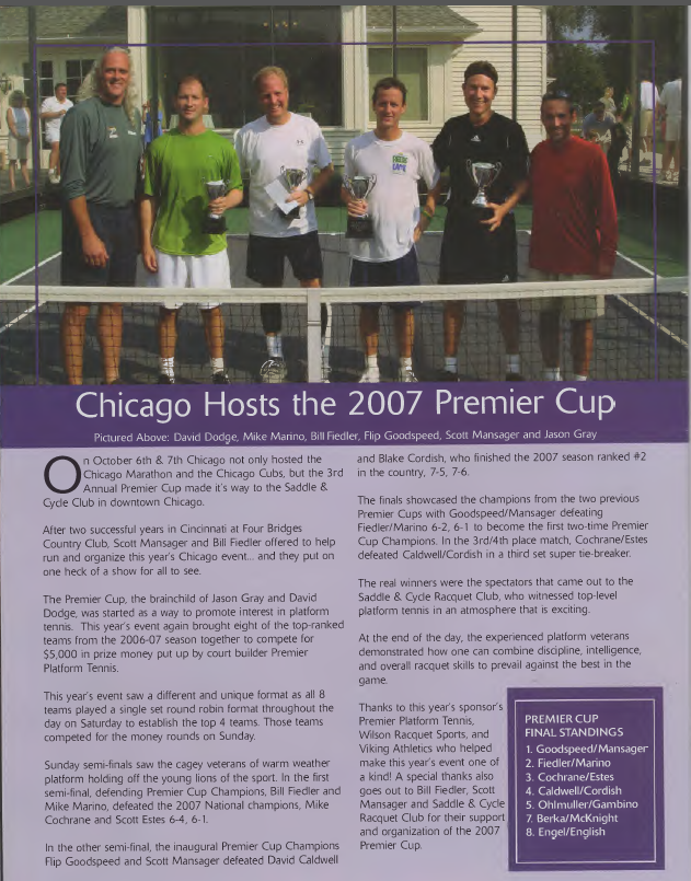 The Premier Cup, the brainchild of Jason Gray and David Dodge, was started as a way to promote interest in platform tennis. This year’s event again brought eight of the top-ranked teams from the 2006-07 season together to compete for $5,000 in prize money put up by court builder Premier Platform Tennis.