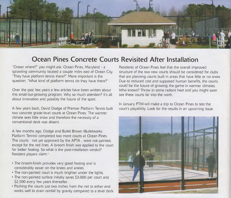 A few years back, David Dodge of Premier Platform Tennis built two concrete grade-level courts at Ocean Pines, Maryland. The warmer climate sees little snow and therefore the necessity of a conventional deck was absent.