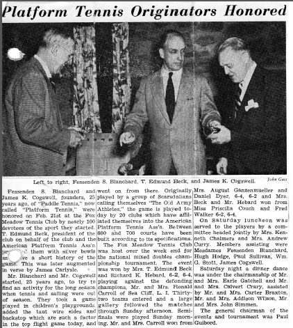 On February 21, 1953, T. Edmund Beck, President of the Fox Meadow Tennis Club, presented silver bowls, on behalf of his club and the APTA, to Jimmy Cogswell and Fessenden Blanchard, to commemorate their founding of the game 25 years ago