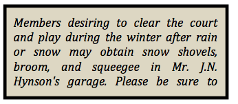 Mole Ware recalled: “In the thirties and forties, for many young people and for two transplanted Bostonians—Fess Blanchard and Jimmy Cogswell—an important part of the Club’s appeal in winter lay in action on the skating rink. In the thirties, the rink skirted the portable paddle courts. Later, in the forties, the skating area was expanded and the large Victrola brought down from the porch to stand on the ice by the tennis backstop. Strains of Viennese waltzes and German polkas wafted over the paddle courts while my father and Mr. Cogswell taught ice dancing to anyone brave enough to try.”