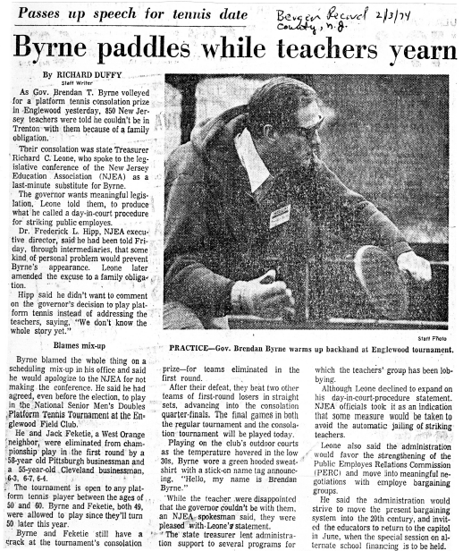 Brendan Byrne had a calendar conflict, a speech to the New Jersey Education Association at their annual conference and a date to play in the National Senior Men’s 50+ at Englewood, NJ. He chose to play paddle, lost his first round match and advanced as far as the semis in the consolation.