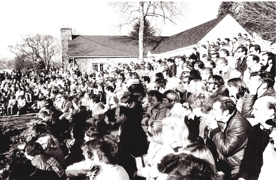 The lucky one’s have seats at the 1977 Nationals at FMTC. Rear: Martin Bowen, Vail Traina, Lois Hebard, Bette Otto, Mike North, Hank Otto. Middle: Molly Ware, Al Traina, Judy and Ron Durning (following man in cap), Bob Rau. Front: John Ware