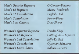 In the second set, Prendergast & Zink pulled out to a wide early lead of 5-0 and ended up bringing it home 6-3. Then, as often happens in this sport, the tide turned and 4-time champs Mary Doten of Hinsdale, IL and Susie Keane of Grosse Pointe, MI overcame defending champions Cindy Prendergast of Wilmington, DE and Lauren Zink of Lititz, PA, 6-1.