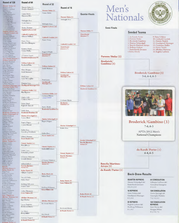 The draw went smoothly with the top eight seeds advancing to the quarter-finals. (See page 25 for full draw.) Showing the depth of new faces in the men’s draw, 7 of the 16 men reaching the APTA Nationals quarterfinals did not do so in 2011.