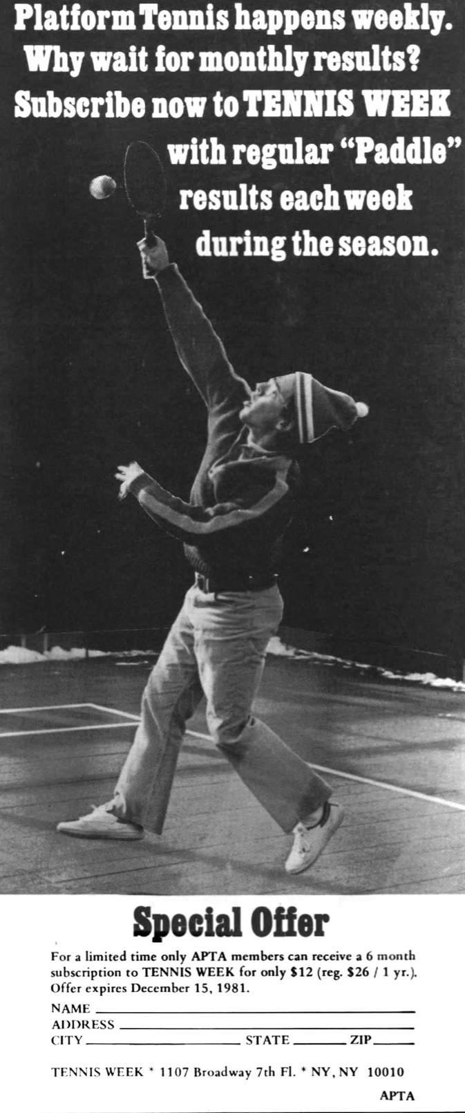 Despite this the Minutes of the APTA Executive Committee of February 9, 1981 reflected the struggle the APTA was having with dwindling sponsorship and the crisis this was having on Tournament play and the APTA’s bottom line. The forecast for 1981 was for a $11,903 loss. [Also see APTA 1981 Annual Meeting Minutes>]