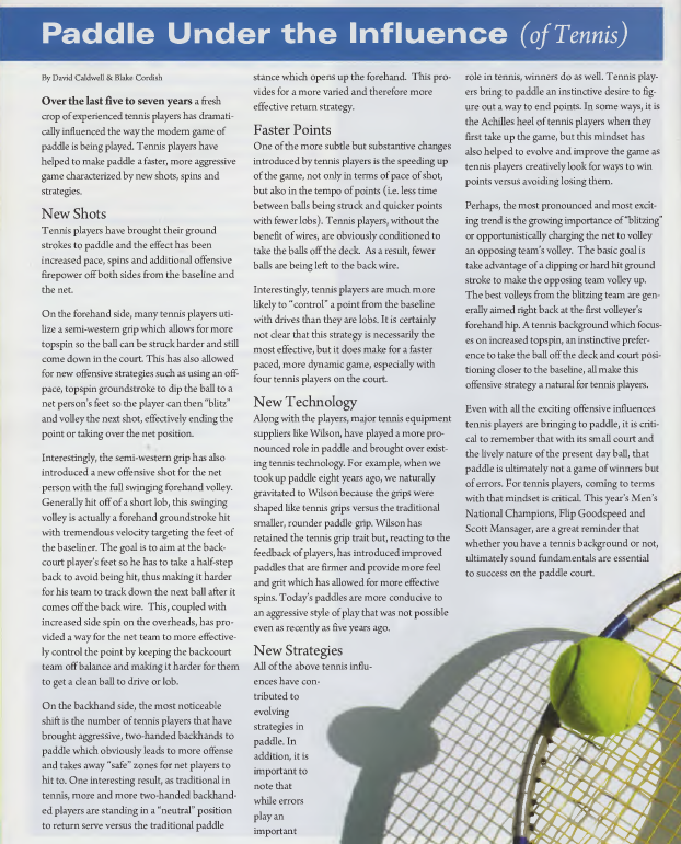 Over the last five to seven years a fresh crop of experienced tennis players has dramatically influenced the way the modern game of paddle is being played. Tennis players have helped to make paddle a faster, more aggressive game characterized by new shots, spins and strategies.