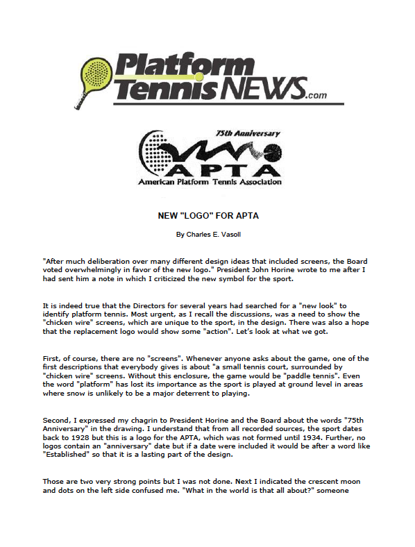 The iconoclastic Platform Tennis News.com was published by 2005 Hall of Fame inductee Charles Vasoll and a former President of the APTA.