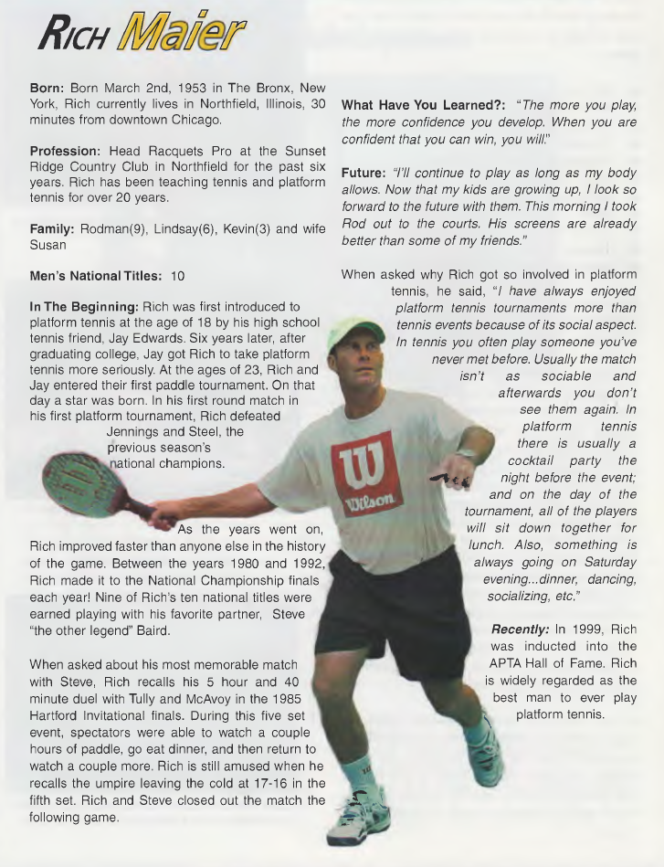 In The Beginning: Rich was first introduced to platform tennis at the age of 18 by his high-school tennis friend, Jay Edwards. Six years later, after graduating college, Jay got Rich to take platform tennis more seriously. At the ages of 23, Rich and Jay entered their first paddle tournament. On that day a star was born. In his first round match in his first platform tournament, Rich defeated Jennings and Steel, the previous season’s national champions.