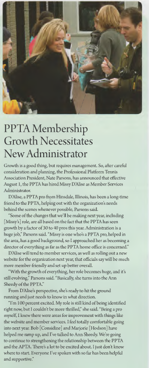 Growth is a good thing, but requires management. So, after careful consideration and planning, the Professional Platform Tennis Association President, Nate Parsons, has announced that effective August 1, the PPTA has hired Missy D’Alise as Member Services Administrator.