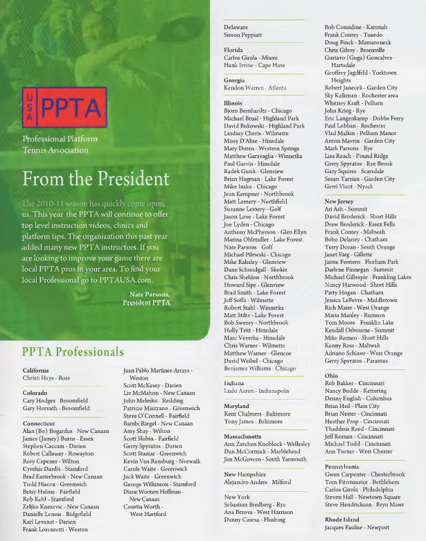 “The 2010-11 season has quickly come upon us. This year the PPTA will continue to offer top level instruction videos, clinics and platform tips. The organization this past year added many new PPTA instructors. If you are looking to improve your game there are local PPTA pros in your area. To find your local Professional go to PPTAUSA.com.