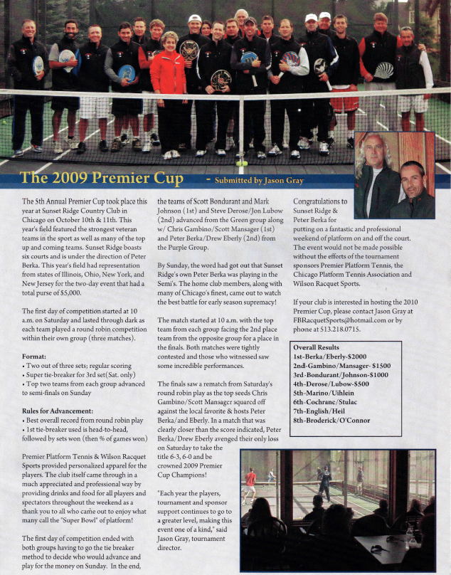 The 5th Annual Premier Cup took place this year at Sunset Ridge Country Club in Chicago on October 10th & 11th. This year’s field featured the strongest veteran teams in the sport as well as many of the top up and coming teams. Sunset Ridge boasts six courts and is under the direction of Peter Berka. This year’s field had representation from states of Illinois, Ohio, New York, and New Jersey for the two-day event that had a total purse ofS5,000.