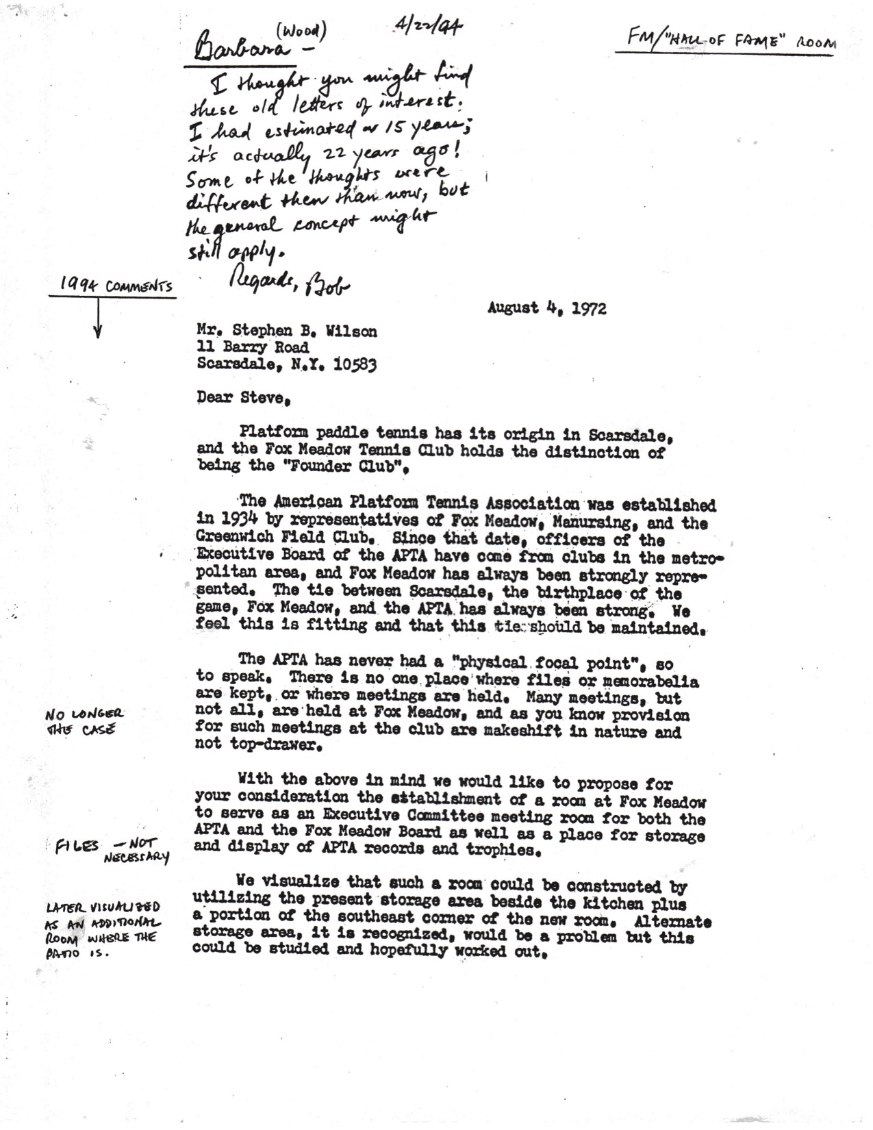 In the summer of 1972 Robert A. Brown, Secretary of the APTA, approached Fox Meadow Tennis Club with the idea of constructing a space to house APTA files and memorabilia.