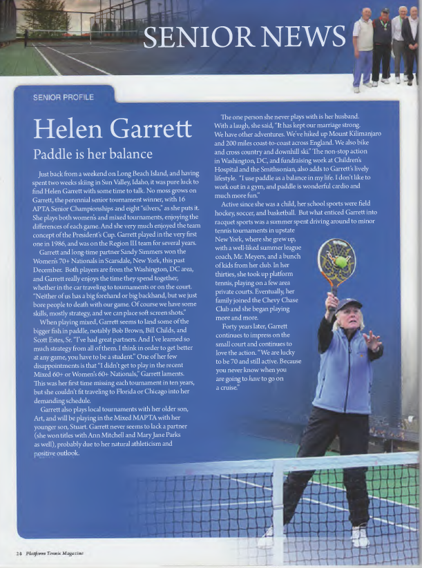 Paddle is her balance. Just back from a weekend on Long Beach Island, and having spent two weeks skiing in Sun Valley, Idaho, it was pure luck to find Helen Garrett with some time to talk. No moss grows on Garrett, the perennial senior tournament winner, with 16 APTA Senior Championships and eight “silvers,” as she puts it. She plays both women’s and mixed tournaments, enjoying the differences of each game. And she very much enjoyed the team concept of the President’s Cup. Garrett played in the very first one in 1986, and was on the Region III team for several years.