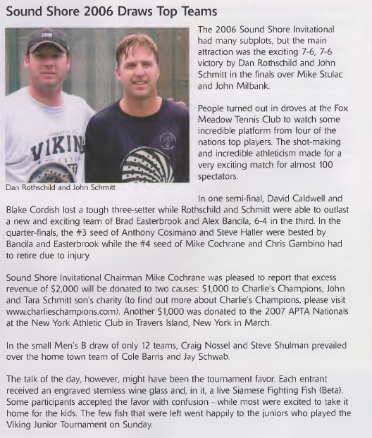 The 2006 Sound Shore Invitational had many subplots, but the main attraction was the exciting 7-6, 7-6 victory by Dan Rothschild and John Schmitt in the finals over Mike Stulac and John Milbank. People turned out in droves at the Fox Meadow Tennis Club to watch some incredible platform from four of the nations top players. The shot-making and incredible athleticism made for a very exciting match for almost 100 spectators.