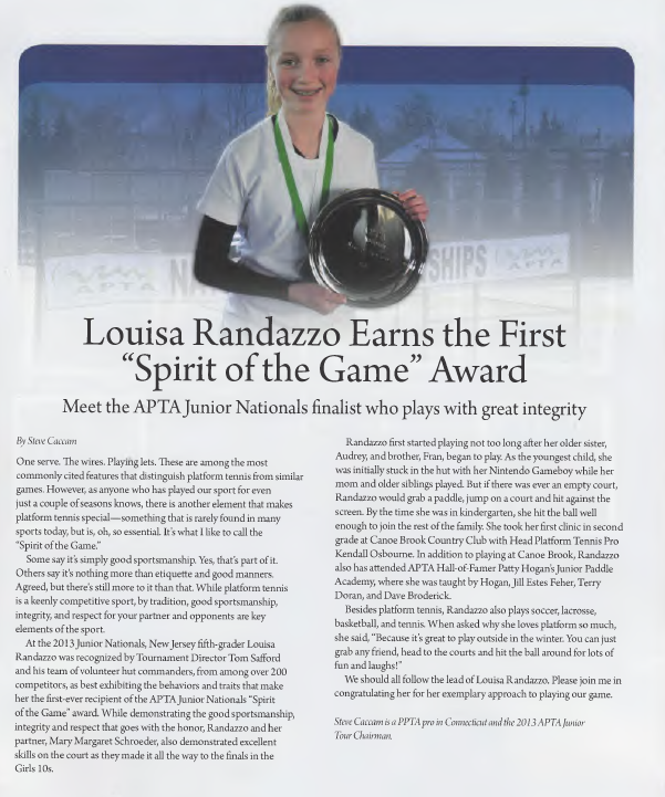 At the 2013 Junior Nationals, New Jersey fifth-grader Louisa Randazzo was recognized by Tournament Director Tom Safford and his team of volunteer hut commanders, from among over 200 competitors, as best exhibiting the behaviors and traits that make her the first-ever recipient of the APTA Junior Nationals “Spirit of the Game” award. While demonstrating the good sportsmanship, integrity and respect that goes with the honor, Randazzo and her partner, Mary Margaret Schroeder, also demonstrated excellent skills on the court as they made it all the way to the finals in the Girls 10s. [enlarge image to read more]