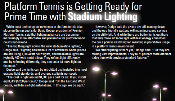 While most technological advances in platform tennis take place on the racquet side, David Dodge, president of Premier Platform Tennis, said that lighting advances are becoming increasingly more affordable and preferable for platform tennis courts nationwide.