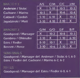 The tournament produced some of the most exciting play ever witnessed on the platform tennis court as the 2005 Nationals winners (Mike Stulac and Bill Anderson) met up against the National finalists (Mike Cochrane and Mike Marino) twice, once in the round robin, and once in a third-place playoff. The finalists defeated the National Champions in both match-ups. When #6-ranked Scott Mackesy could not make the event with partner Scott Estes, former National Champion Bill Fiedler was called in to partner with Estes. The pair had a close loss to Goodspeed / Mansager before winning 10-1 over David Ohlmuller and Chris Gambino and 10-2 over Rob Pierce and Greg Bennett. In the semi-finals, Estes and Fiedler cooled the smokin’ hot team of Cochrane and Marino 6 2, 6-2 Perhaps the biggest surprise of the tournament was the dominating performance of Flip Goodspeed and Scott Mansager who lost 13 games in the three-match round robin before tightening up and dropping only five games in semi-final and finals action.