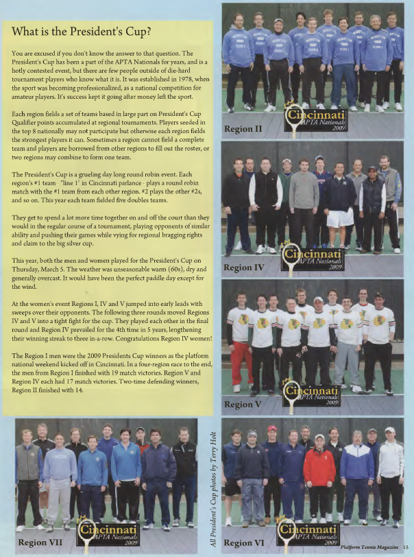 You are excused if you don’t know the answer to that question. The President’s Cup has been a part of the APTA Nationals for years, and is a hotly contested event, but there are few people outside of die-hard tournament players who know what it is. It was established in 1978, when the sport was becoming professionalized, as a national competition for amateur players. It’s success kept it going after money left the sport.