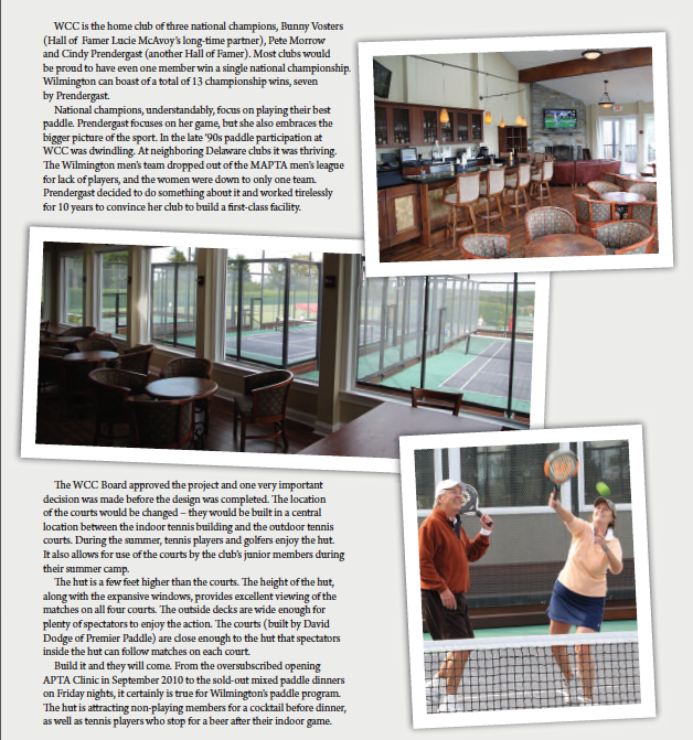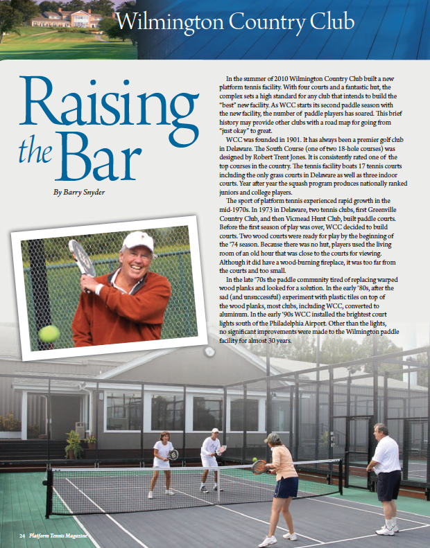 In the summer of 2010 Wilmington Country Club built a new platform tennis facility. With four courts and a fantastic hut, the complex sets a high standard for any club that intends to build the “best” new facility. As WCC starts its second paddle season with the new facility, the number of paddle players has soared. This brief history may provide other clubs with a road map for going from “just okay” to great.