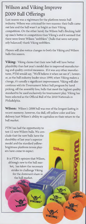 Last season was a nightmare for the platform tennis ball industry. Wilson was criticized for two reasons: their balls came out late and the ball wasn’t as bright as their Viking competition. On the other hand, the Wilson ball’s flocking held up much better in competition than Viking’s and it seemed that there were fewer Wilson “wobblers” (balls that were not properly balanced) than Viking wobblers.