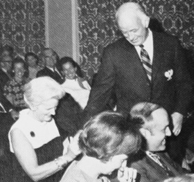 The awards presentation at the 1956 Men’s Nationals (from left): Bill Pardoe, George Harrison, Ted Cook (APTA president and tournament chair), Don McNeill, and Herman Schaefer The awards presentation at the 1956 Men’s Nationals (from left): Bill Pardoe, George Harrison, Ted Cook (APTA president and tournament chair), Don McNeill, and Herman Schaefer - Source: Fox Meadow Tennis Club - The First Hundred Years Shirley Harrison inspects the tailoring of George's newly-won Green Jacket at the Honor Award ceremony in 1969 Shirley Harrison inspects the tailoring of George's newly-won Green Jacket at the Honor Award ceremony in 1969 - Source: Fox Meadow Tennis Club - The First Hundred Years