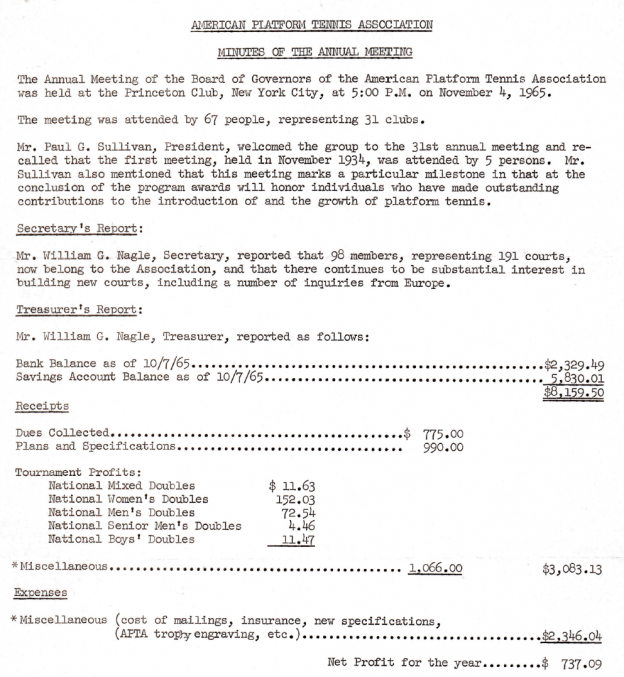 On February 18, 1965, the APTA gave out the inaugural Honor Awards to individuals who had made outstanding contributions to platform tennis. The awards were to be presented when the association’s Executive Committee felt that one or more individuals merited inclusion in the group of men and women who had created the game, nurtured it, or played it as champions.