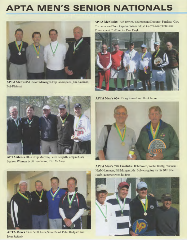 At this year’s National 45s/55s/65s Championship, a tape of the 1976 Men’s Nationals was playing in the paddle hut. The play was dominated by lobs and soft overheads to the corners. There was an occasional flat forehand drive. There were no Mansager-like crushing forehands, no Goodspeed-like two-handed backhand drives, and no Uihlein super cut overheads. Contemporary players look much quicker and more athletic. A few players in the hut said that today’s top players are definitely better than the best players of the ’70s. Others agreed that athletes in all sports are better today than they were 30 years ago – track times are faster, pole vaults are higher, basketball players are taller, and football players are bigger.