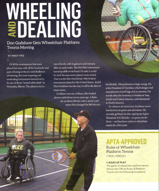 Of all the tournaments that were played last year, with all the heartache and pain of losing or the joy and ebullience of winning, the most inspiring and motivating tournament turned out to be one of those “round robin deals” in Winnetka, Illinois. The players were a mix of levels, with beginners and veterans alike on each court. But this little tournament turned paddle on its head. Or tails, it could be said. Because some players were seated. This was the first wheelchair/able-bodied tournament played in the United States. And if Don Godshaw has his way, it will be the first of many more.